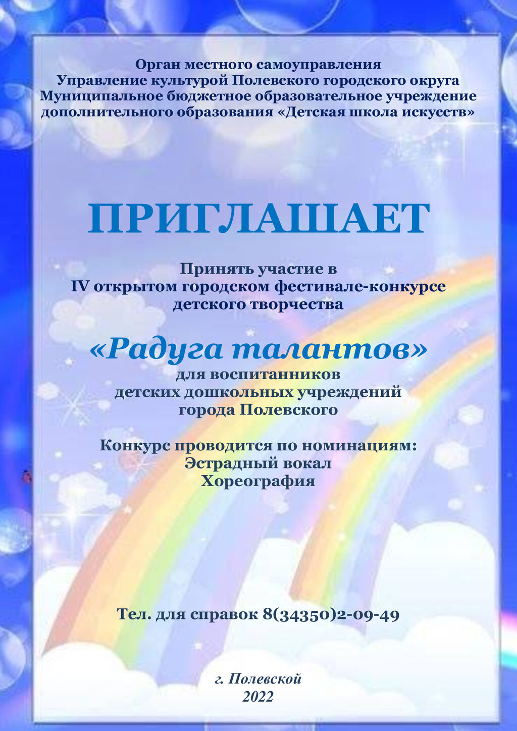 IV ОТКРЫТЫЙ ГОРОДСКОЙ ФЕСТИВАЛЬ - КОНКУРС ДЕТСКОГО ТВОРЧЕСТВА «РАДУГА ТАЛАНТОВ» (эстрадный вокал, хореография), 2022